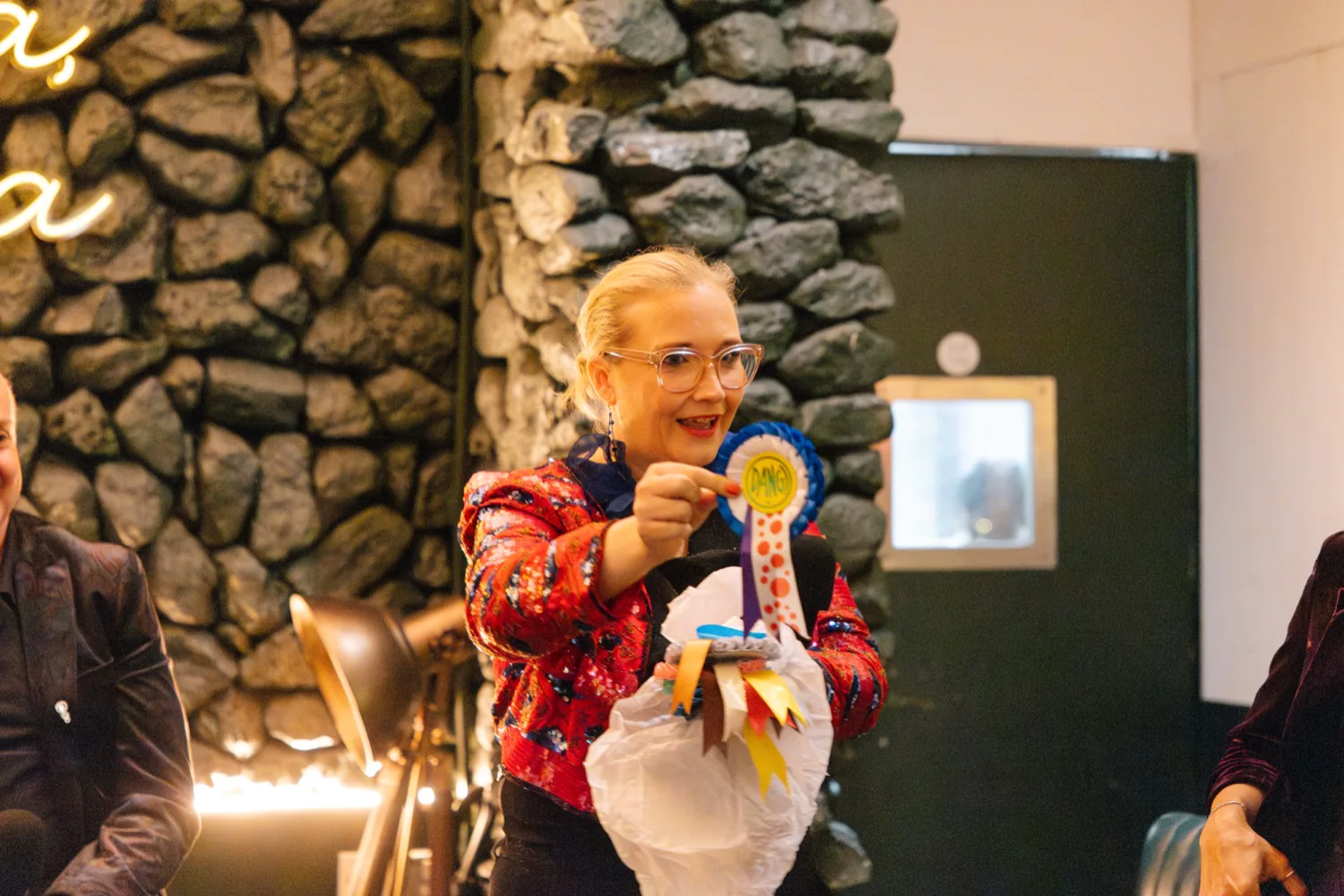 Sparkling welcome drinks. Tote bags in multiple colours. Little pins to take home. Handwritten thank you notes for each guest. Jenny surprising the team with DANG ribbons—"a small symbol of something big."